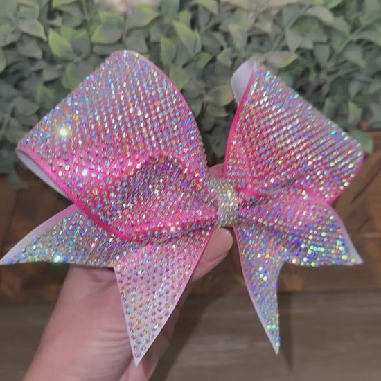 Make an unforgettable statement at your next competition with this stunning fully blinged cheer bow featuring an impressive 5,000 individual SS10 rhinestones meticulously placed on the front for the ULTIMATE sparkle. Each bow showcases a beautiful ombre effect that seamlessly blends from crisp white into your choice of vibrant center color, finished with a sparkling rhinestone center.
